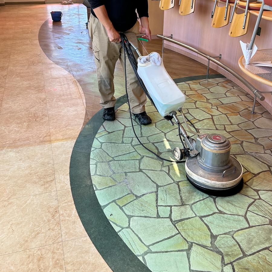 靴で歩く店舗の床は汚れやすく、日頃のお手入れでは上手に汚れがとれないことも…。